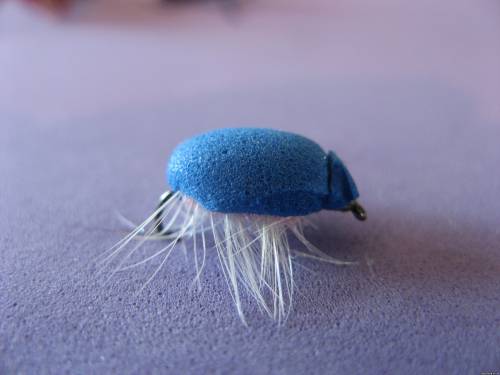 Крючок: № 10-14 Монтажная нить: Uni 8/0 серая Спинка: пенка синего цвета Ножки: белое перо петуха, намотанное поверх тела Тело: светлый даббинг Головка: пережатая пена цена:10 грн. |